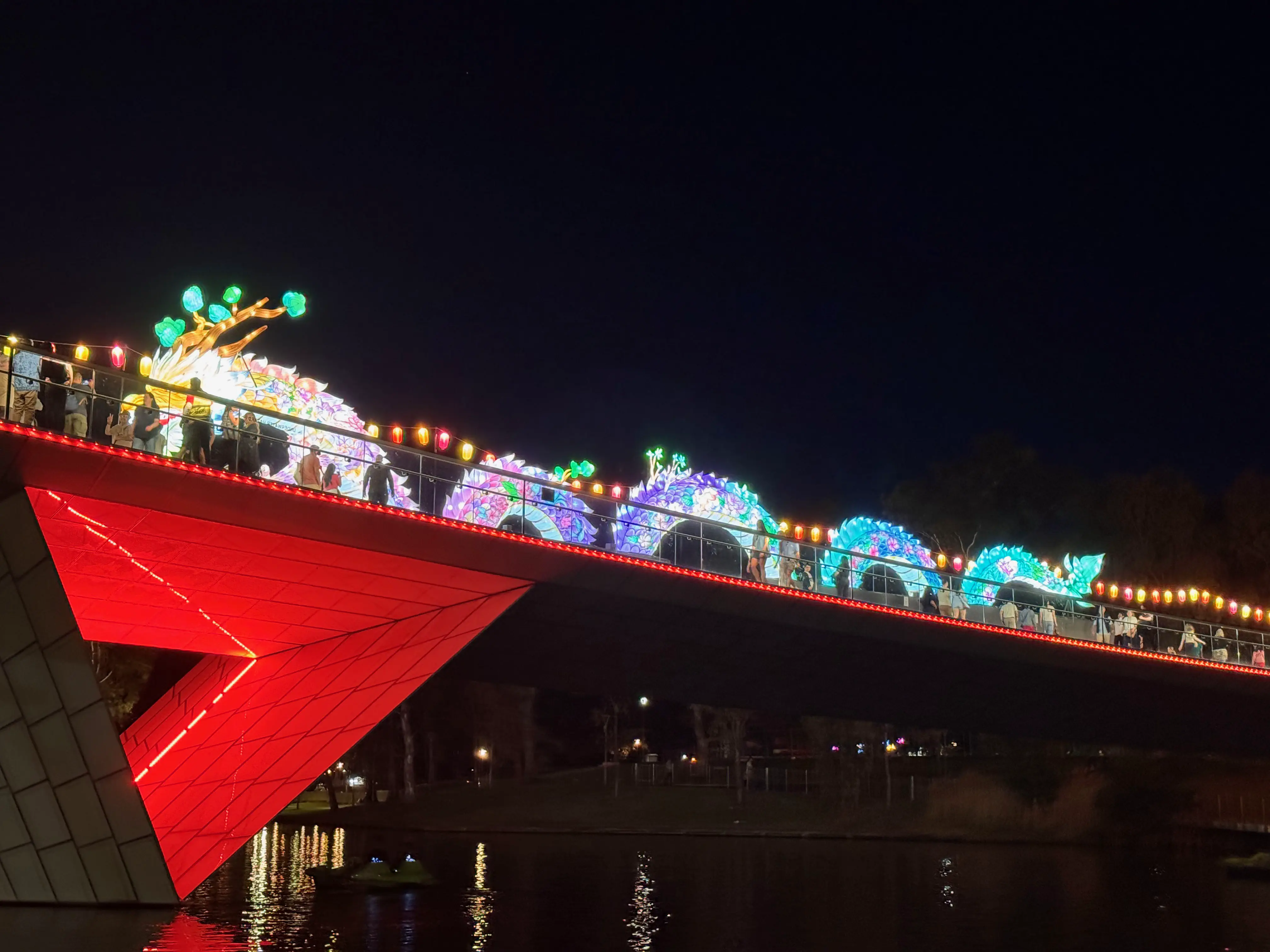 I took the family to see the Hong Kong dragon, installed on the pedestrian bridge over the river Torrens (Karrawirra Parri / Karrawirraparri).